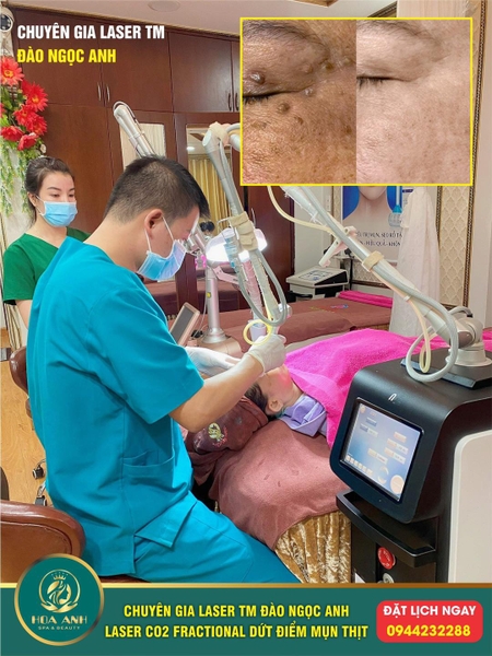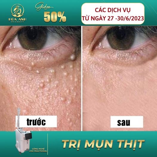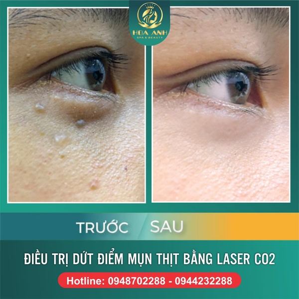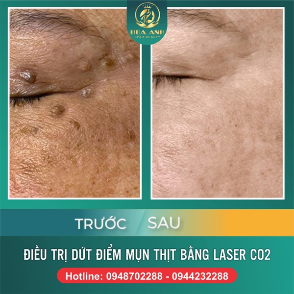 - Hiệu quả trong việc loại bỏ mụn thịt: Laser CO2 fractional có khả năng xâm nhập sâu vào da và làm mờ, loại bỏ các cụm mụn thịt dưới da. Ánh sáng laser tạo ra những "cột" vi tính trên da, giúp kích thích quá trình tái tạo da mới và làm mờ mụn thịt.