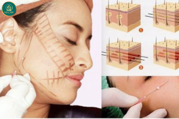 - Tiến hành luồn chỉ collagen qua những điểm đã được vẽ và nâng cơ mặt bằng cách đưa chỉ vào dưới da và kéo căng để tạo độ căng và cân đối.