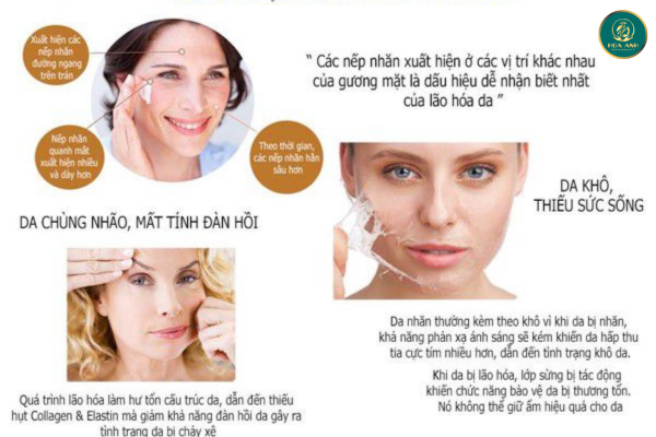 Làn da lão hóa sẽ xuất hiện các nếp nhăn, mất đi sự săn chắc, căng mịn. Da trở nên khô ráp, có đốm nám, sạm ...